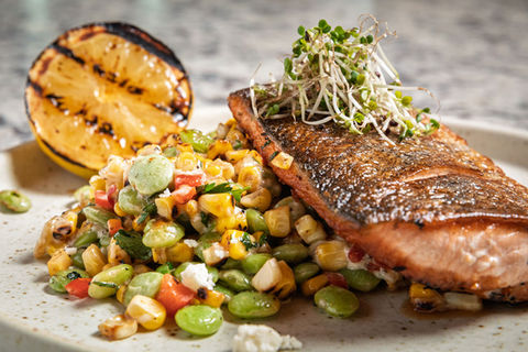 8 oz salmon filet, street corn succotash, charred lime, micro greens.
