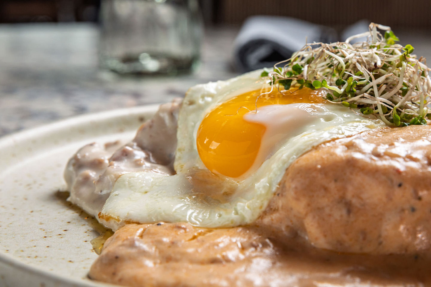 Includes 3 eggs and choice of 2 sides: bocado greens,